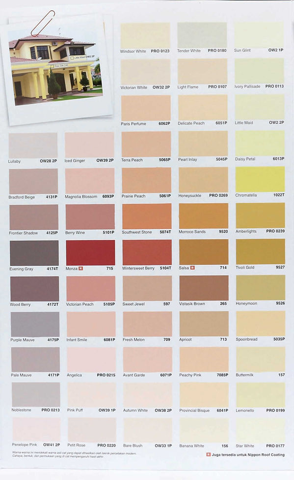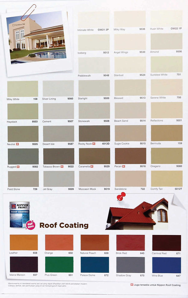Kami merekomendasikan untuk mengacu pada Kartu Warna kami yang tersedia di toko cat atau bahan bangunan terdekat.